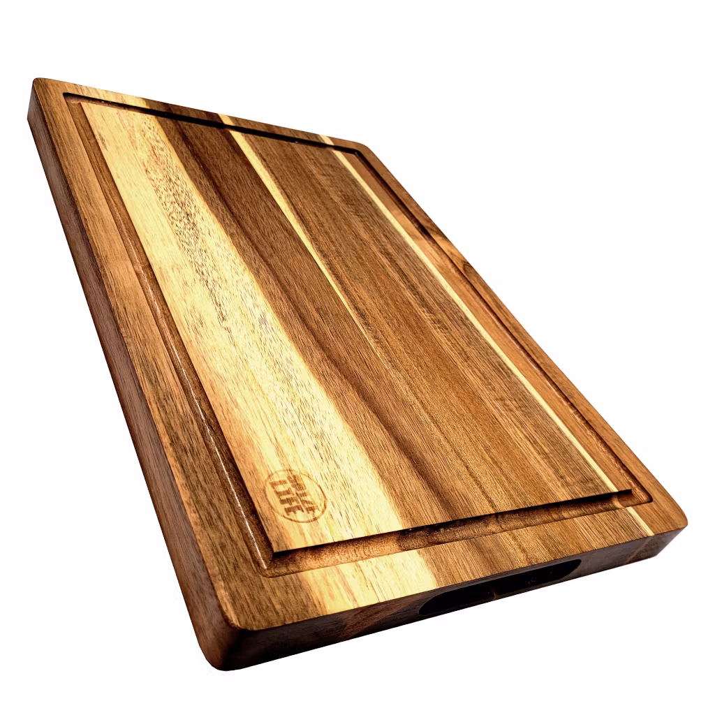Rejäl skärbräda med saftskåra och handtag. Tillverkad av slitstarkt akaciaträ vilket ger lång livslängd. Alla skärbrädor har unik trästruktur.