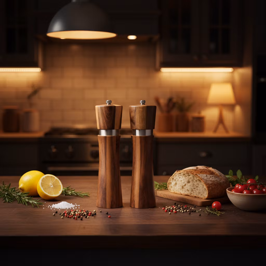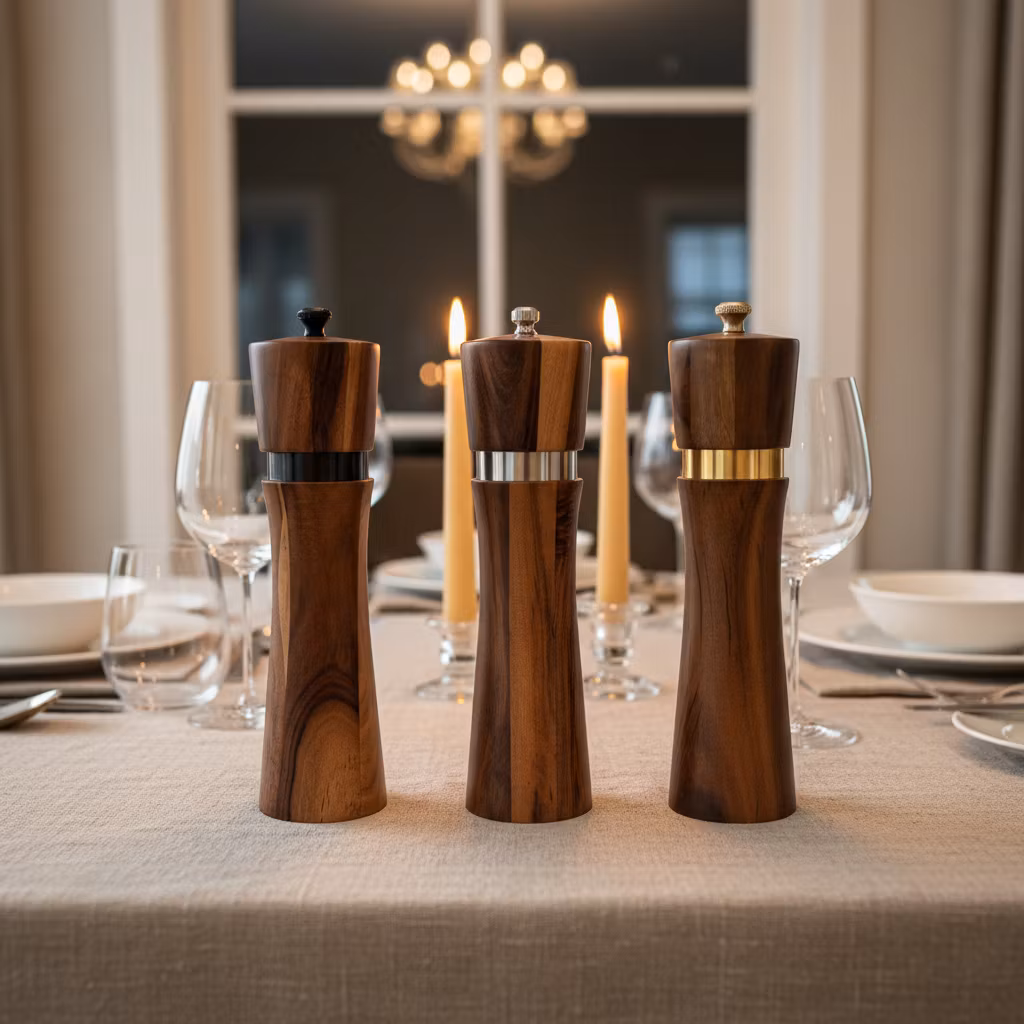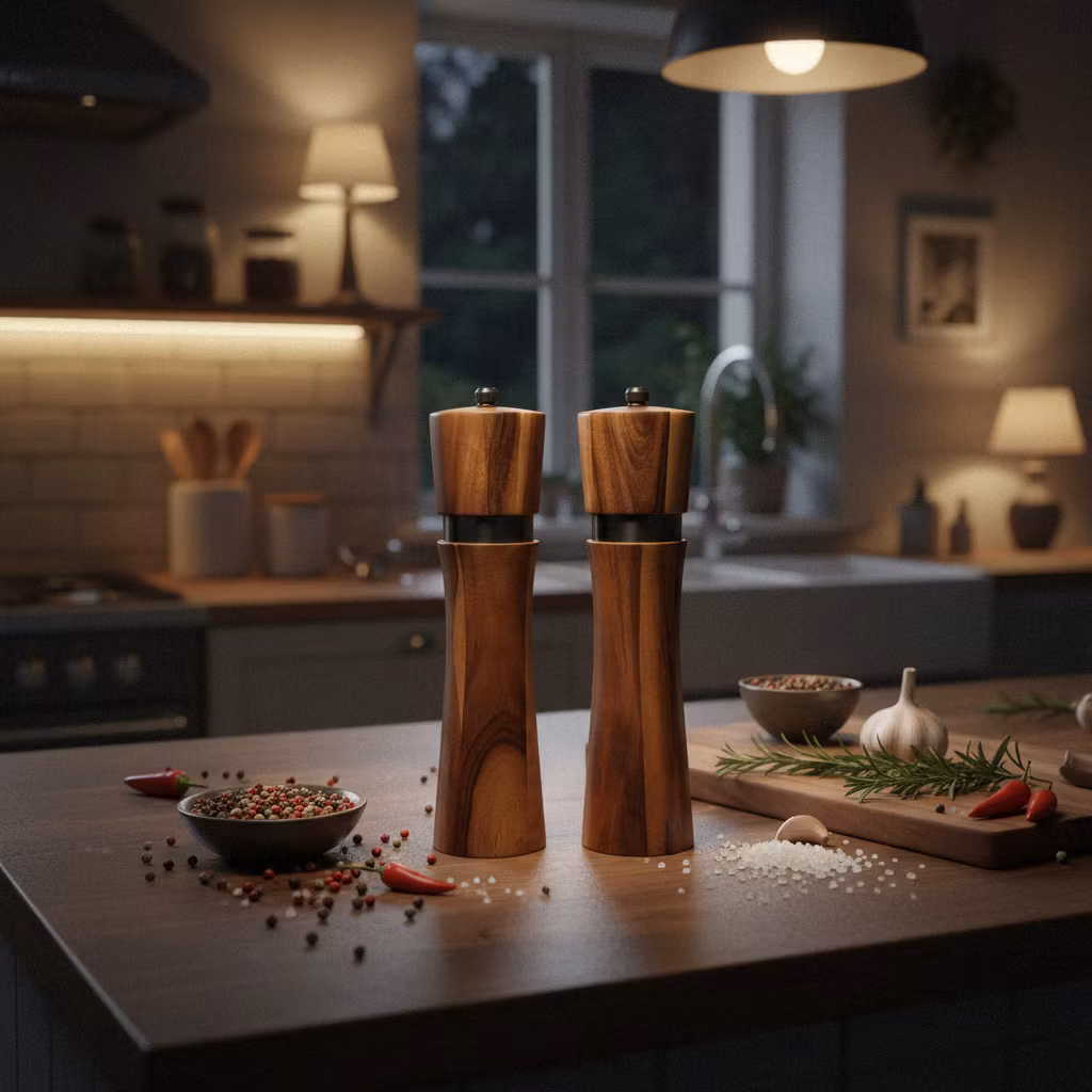 Tillverkade av massivt akaciaträ med keramisk rotor och detaljer av rostfritt stål, ingen plast.